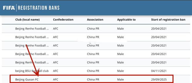 FIFA官方傳來消息,北京國安收到一則轉(zhuǎn)會注冊的禁令,處罰期無限期,一直到問題解決,才可能解除轉(zhuǎn)會禁令。在此期間,不得操作國際、國內(nèi)的轉(zhuǎn)會,以及注冊新的球員。